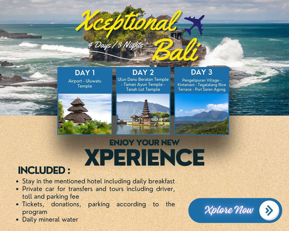 Experience the ultimate 4-day, 3-night getaway with our Xceptional Bali package. Enjoy luxurious accommodations at a top-rated hotel with daily breakfast to kickstart your mornings.