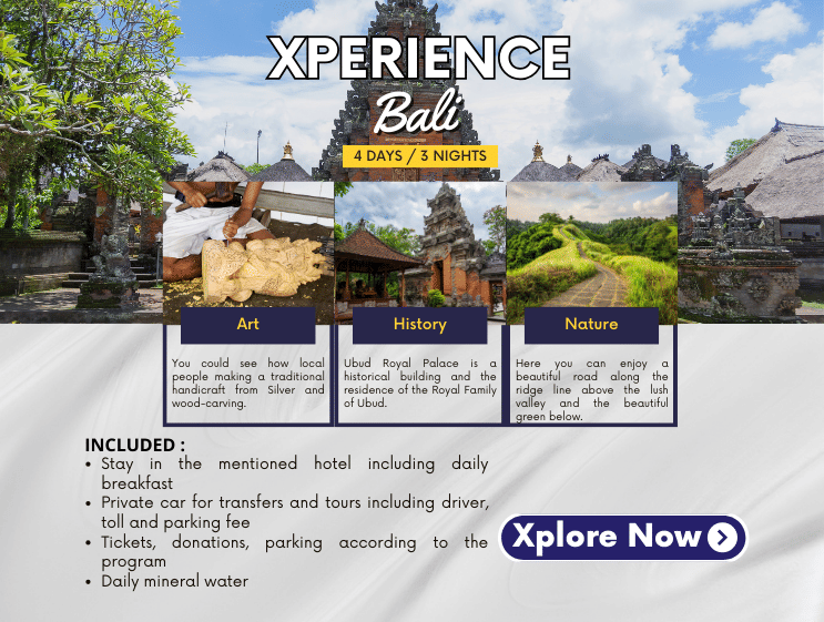 Embark on a 4-day, 3-night journey of discovery with our Xperience Bali package. Immerse yourself in the beauty and culture of Ubud, Celuk, Mas Village, Tegallalang, and more. Visit iconic landmarks like Batuan Temple and take a scenic stroll along Tjampuhan Ridge. Experience the magic of Alas Harum and indulge in daily breakfast at our featured hotel. Enjoy hassle-free travel with private car transfers and guided tours, including a dedicated driver and all tolls and parking covered. Dive deeper into Bali's rich heritage with included tickets, donations, and parking fees. Stay refreshed with complimentary daily mineral water.
