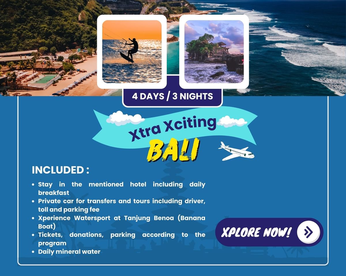 Experience the thrill of Bali with our 4-day, 3-night Xtra Xciting package. Dive into adventure with water sports at Tanjung Benoa, then explore cultural gems like Uluwatu Temple and the serene beauty of Melasti Beach. Witness the breathtaking sunset at Tanah Lot Temple.