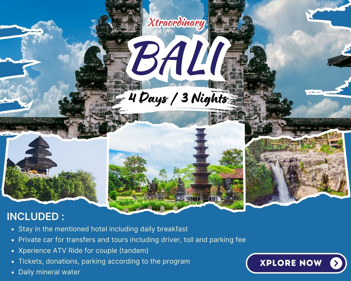 Embark on a 4-day, 3-night adventure through the enchanting landscapes of Bali with our Xtraordinary Bali package. Immerse yourself in the cultural and natural wonders of the island as you explore iconic destinations like Uluwatu, Lempuyang Temple, Tirta Gangga, and Virgin Beach.