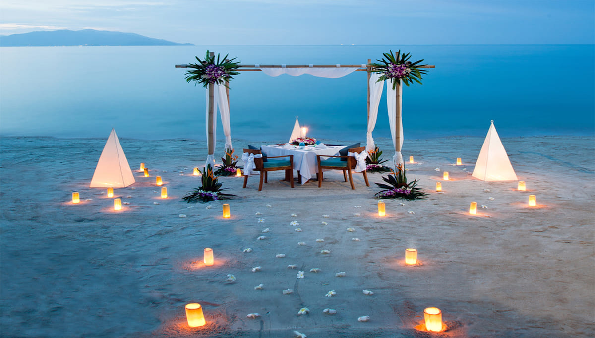 As day turns to dusk, candles are strategically placed on the beautiful white sands in front of this high-end, stylish property. With the refreshing sea breeze snapping at the canopy over head, you will be seated at a private table lavishly adorned for two.
