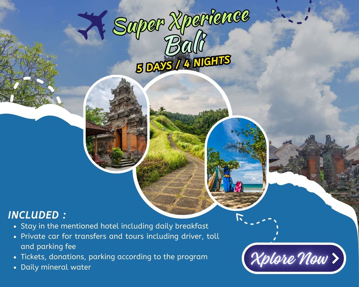 Embark on a 5-day, 4-night Super Xperience in Bali, venturing through cultural treasures like Celuk and Mas Village, Batuan Temple, and Ubud Palace. Delight in the lush landscapes of Alas Harum Tegalalang Rice Terrace and the scenic Tjampuhan Ridge Walk. Then, unwind on Peninsula Island and Kuta Beach, where azure waters meet golden sands. Immerse in Balinese hospitality, savoring local cuisine and interacting with artisans. Whether exploring ancient temples or basking in natural beauty, each moment promises awe and adventure. Prepare for an unforgettable journey, blending cultural immersion, breathtaking vistas, and beachside bliss on this magical island getaway.