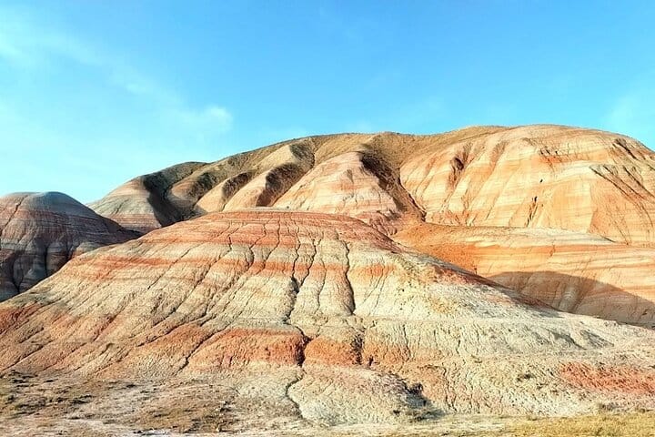 The route continues toward the Candy Cane Mountains, a unique geological formation recognized for its vividly striped sedimentary layers. These multicolored strata, primarily composed of iron oxide-rich claystones and siltstones, reflect mineral oxidation processes that occurred over millions of years.