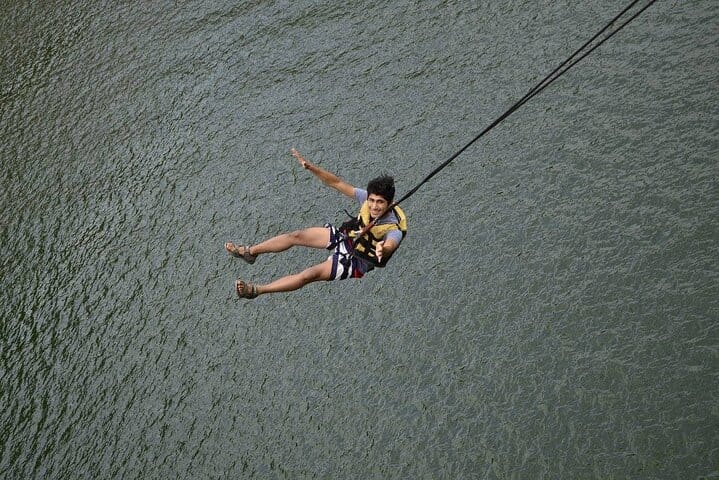 - ZIPLINE: The Zipline rope consists sliding through a rope above the water of 200 metres long, held with a harness from the waist.