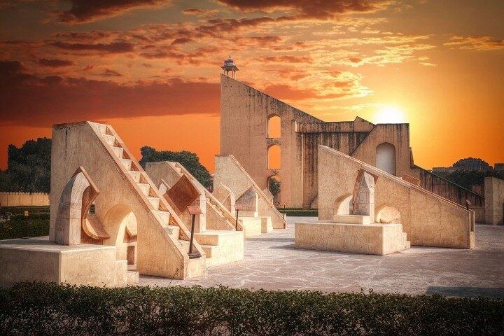 The Jantar Mantar monument in Jaipur, Rajasthan is a collection of nineteen architectural astronomical instruments built by the Rajput king Sawai Jai Singh II, and completed in 1734. It features the world's largest stone sundial, and is a UNESCO World Heritage site. It is located near City Palace and Hawa Mahal.