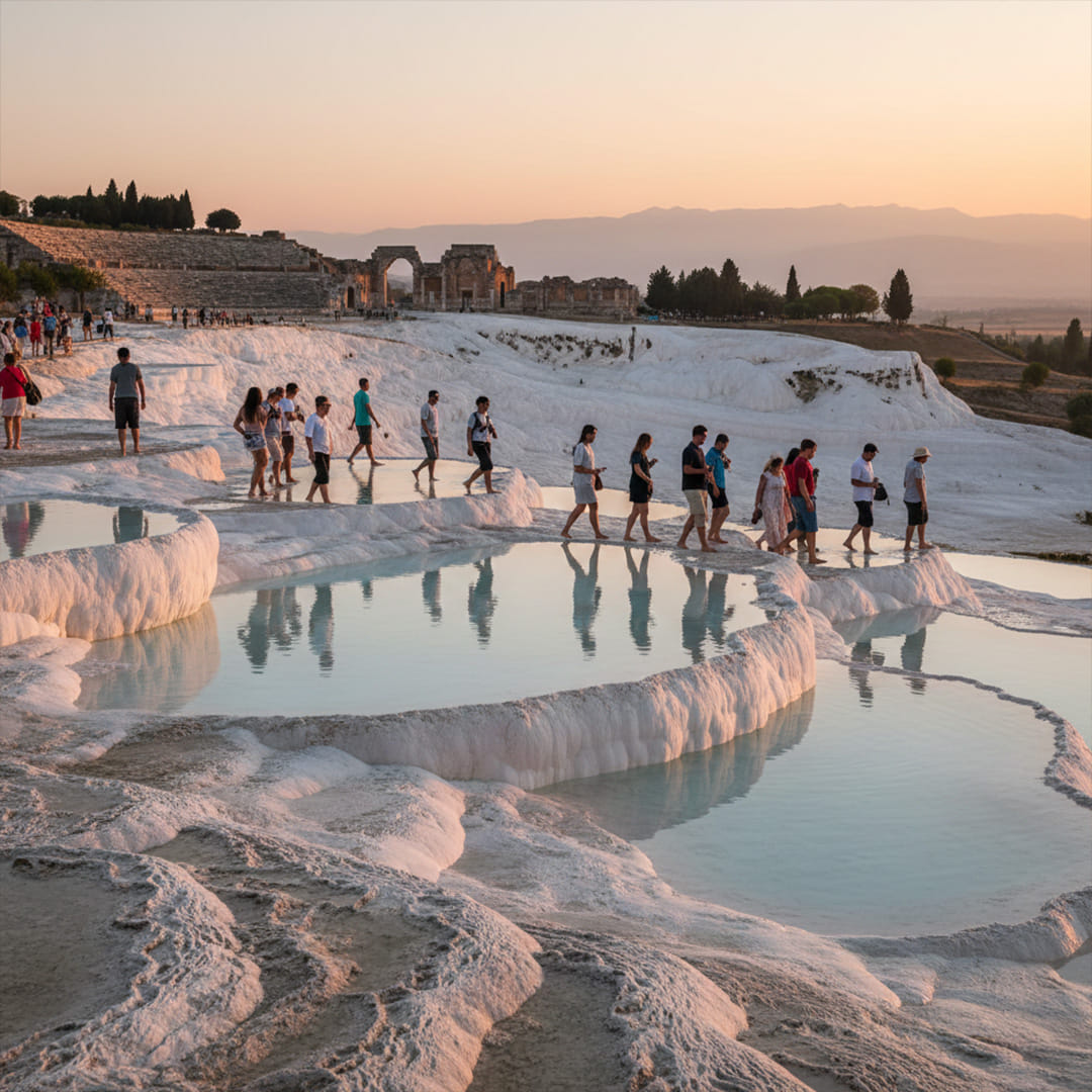 After breakfast, depart from Cappadocia toward Pamukkale. En route, stop at the Sultanhan Caravanserai, a magnificent 13th-century Seljuk inn that once hosted Silk Road traders. Upon arrival in Pamukkale, explore the stunning Cotton Castle travertine terraces and the ancient city of Hierapolis. Walk barefoot through the warm, mineral-rich waters and visit the ancient theater, Roman baths, and necropolis. Optional: Take a dip in the famous Cleopatra Pool, surrounded by ancient marble columns. Dinner and overnight stay in Pamukkale.