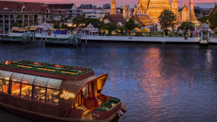 The newly refurbished Apsara Dinner Cruise is an elegant dining experience on Bangkok’s Chao Phraya River, offering guests a luxurious Thai dinner aboard a beautifully restored traditional rice barge. As the cruise glides along the river, guests enjoy stunning, illuminated views of Bangkok’s landmarks, including the Grand Palace, Wat Arun, and Rama VIII Bridge. The Apsara Dinner Cruise is known for its authentic Thai cuisine, with a carefully crafted multi-course menu that highlights traditional flavors and local ingredients. With its serene ambiance and exceptional service, the cruise provides an unforgettable way to experience Bangkok’s vibrant night scenery and rich culinary heritage.