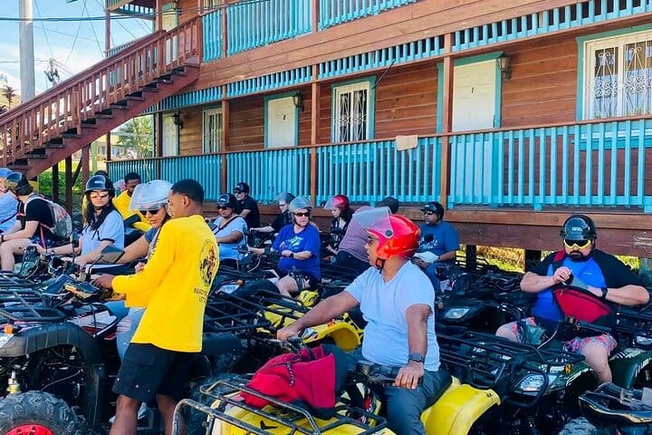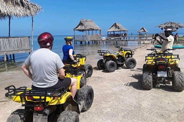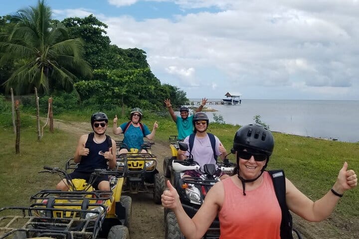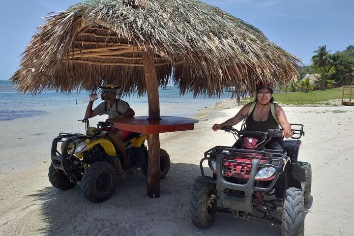This all-inclusive ATV Snorkeling And lunch adventure Departing from the pier on the South Shore of the island in your small group, you will first make your way towards the island's East End. Along the way you will hear of the island's colorful history, which includes Indians, slaves, invaders, pirates, buried gold, and a charming blend of cultures, people and languages. The main languages are Spanish, English, and Garifuna, which holds on to its African roots. You will make your first stop at our famous island flavor restaurant were you will get a safety instructions and information before the staff will pass out your gear and show you to the ATVs. You will have a practice session to get familiar driving the ATV before you head out. These are new model, easy-driving, automatic ATV's, making it easy for all to drive. Note that this is a controlled, guided ATV excursion with no speeding, etc. allowed. Helmets must be worn at all time during the excursion. Guests 8 years old and up are welcome as passengers for double riding option, single ATV riders must be 16 years of age or older on this tour You will pass through several of the small villages of the island including politely bight,punta gorda, barrio ingles