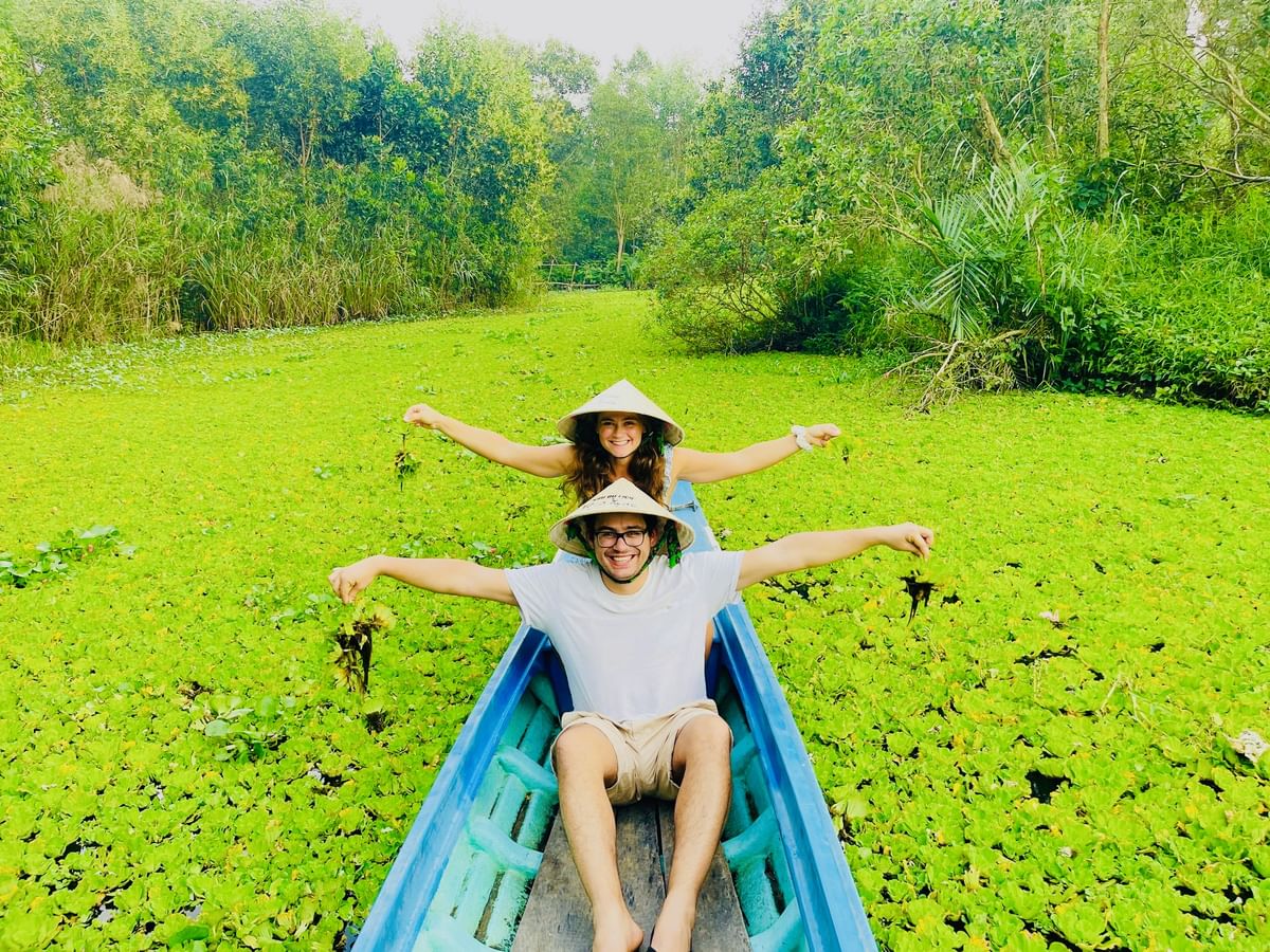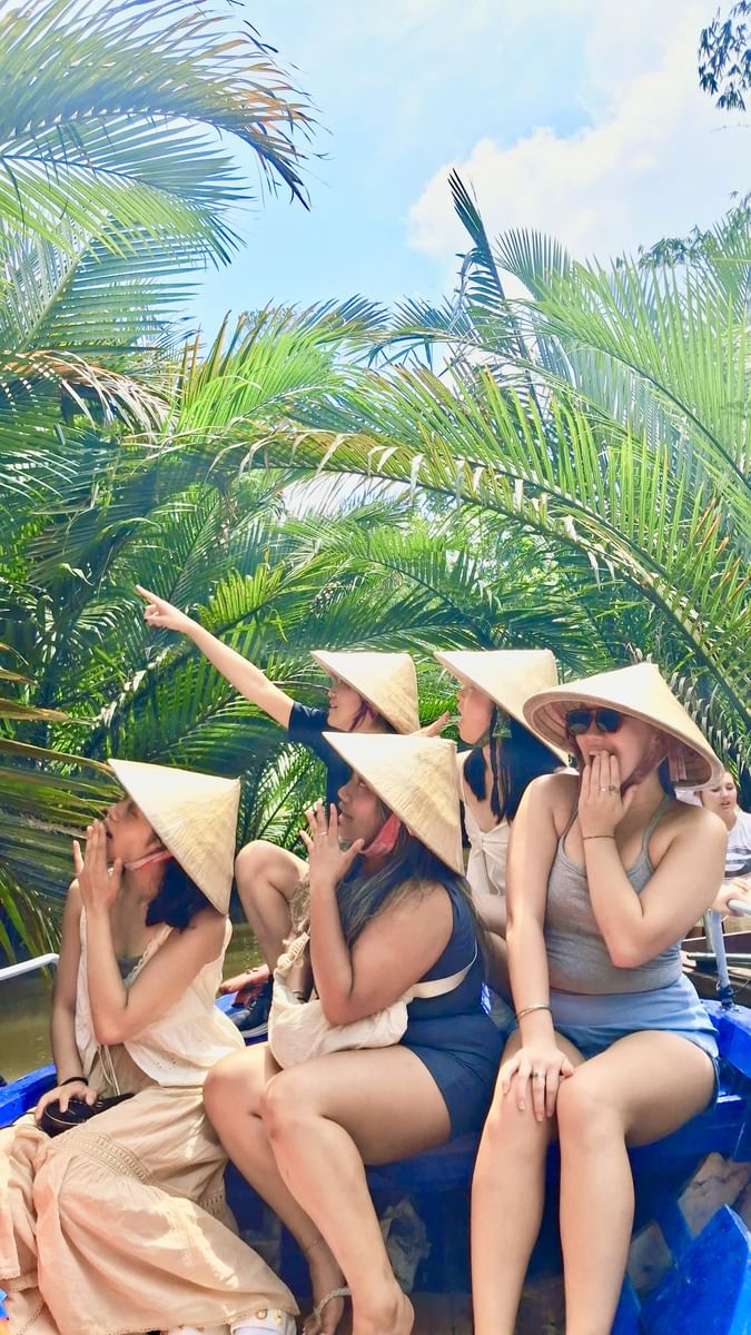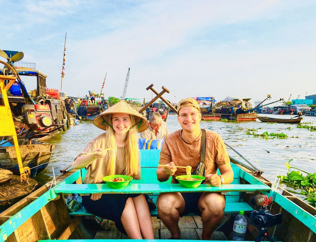 Cai Rang Floating Market: Float among lively boats filled with fresh pineapples, watermelons, and vegetables while enjoying warm ‘shaking’ rice noodle soup and rich Vietnamese coffee right on the water.