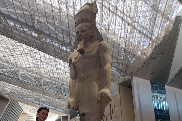 so meeting at the hotel lobby or your chosen location on time you have picked while booking this experience , by our licensed guide , then driving towards The Grand Egyptian Museum , the World's Largest Museum with its impressive Colossal statue of King Ramses II and the Great staircase which hosts tens of egyptian artifacts ending with the view of Giza Pyramids .
