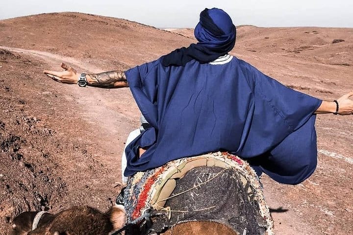 Escape to the desert outside Marrakech for a 1 hour camel ride in a small group on the rugged terrain of North Africa. Put on your protective headscarf and climb aboard your camel for a ride among the natural groves of palm trees and the changing light of the desert sky. Then, take a break in a Berber tent to enjoy a warm welcome, accompanied by a Moroccan tea and g cakes. This small-group trip, limited to 16 people, also includes air-conditioned round-trip transportation, and a sun protection scarf.