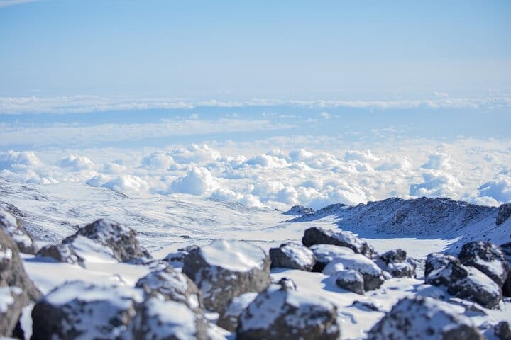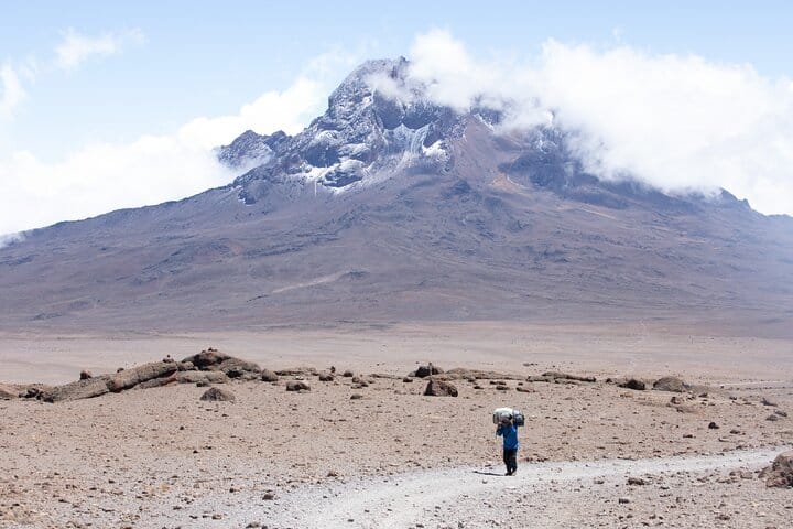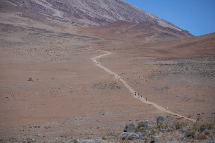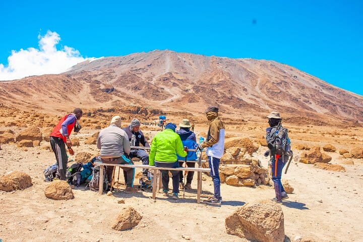 Ascending, we now pass the last watering point, walking onto the saddle of Kilimanjaro between the peaks of Kibo and Mawenzi. Vegetation begins with the upper heathland but disappears into a “moonscape.” Dinner, rest, and prepare for the summit climb.