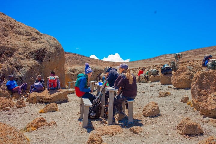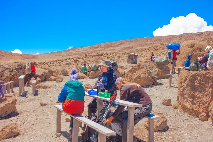 Wake up for breakfast (approx. 7:30 a.m.) and pack for the next leg. Break camp at about 8:30 am and hike to Horombo Hut. This leg should take 5 to 6 hrs. You travel through lower-heath land with small shrubs being the main vegetation. Stop halfway for lunch. Views of Mawenzi are amazing. The summit of Kibo can be seen from Horombo Huts. Arrive at Horombo Huts at about 3 p.m. Rest, unpack, and prepare for dinner. Bathrooms are available with running water.