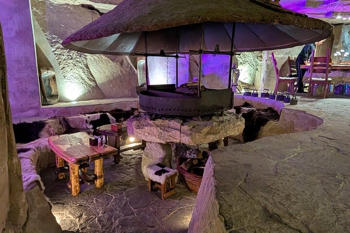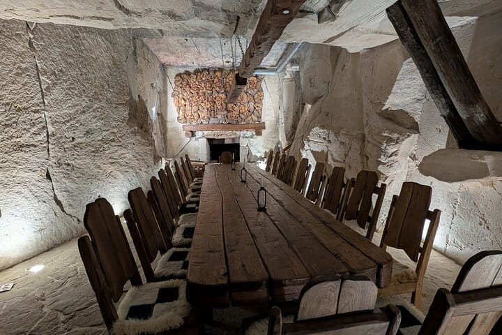 At Brănești Winery, there are two tasting halls, one of which is located underground. These halls are beautifully decorated with wood and metal, showcasing themes related to vine cultivation and winemaking. Enjoy lunch at the Stone Age Complex of Pivnitele from Brănești Winery, where, thanks to the lack of internet and mobile phone signals, you can fully disconnect from the modern world and enjoy the peaceful surroundings away from city noise.