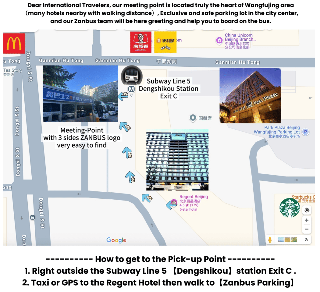 Pick-up location: Regent Hotel parking lot, Metro line 5 [Dengshikou Station] Exit C. Return time: 17:30 (daily).