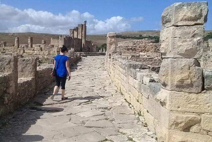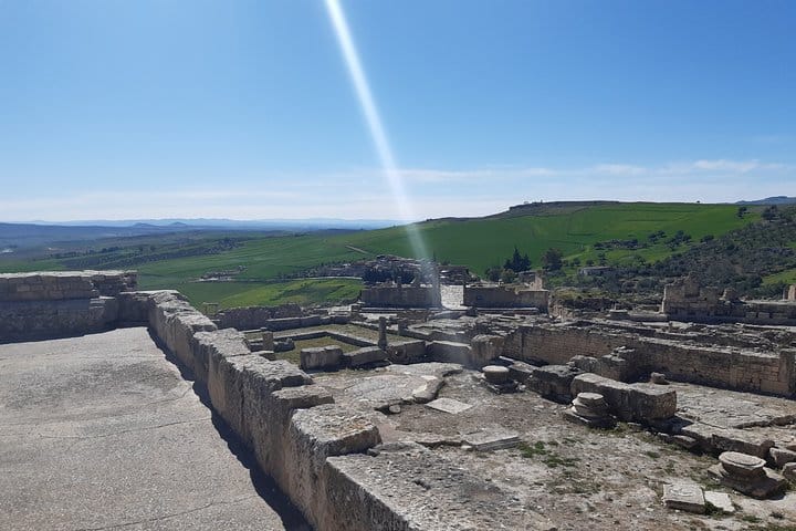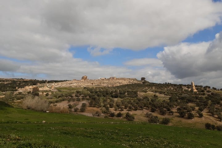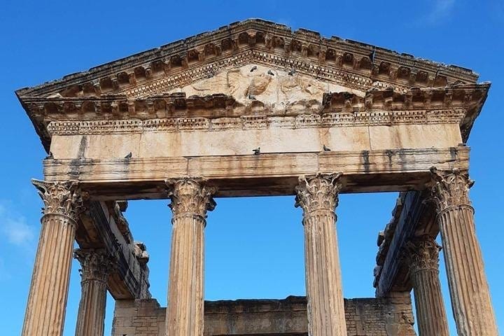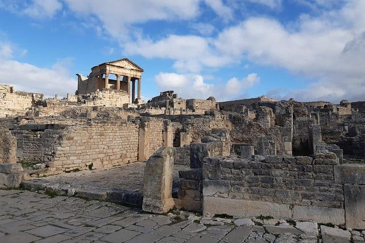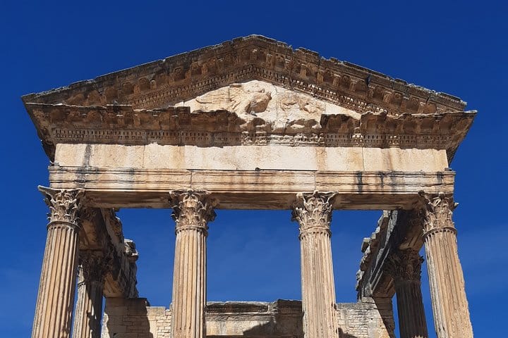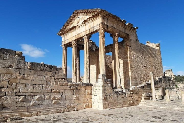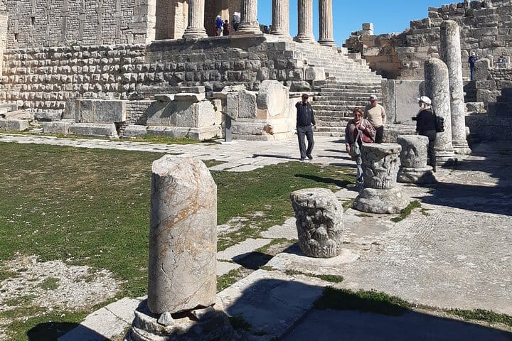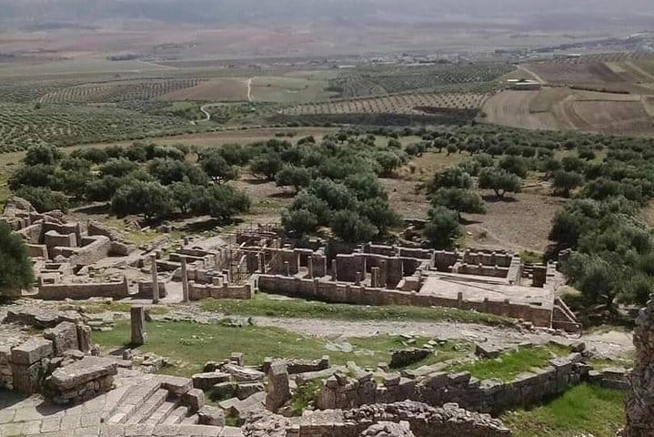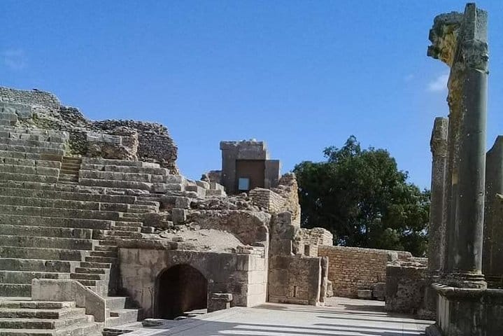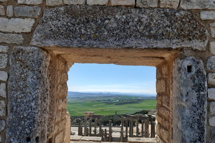 Join us for a guided visit of the archaeological site of Dougga, lasting two hours and led by a knowledgeable official guide. They will share intriguing facts about the extensive ruins of this well-preserved Roman town, which is situated on a hilltop overlooking the surrounding valleys dotted with olive plantations. The journey to Dougga takes you through a beautiful rural landscape.