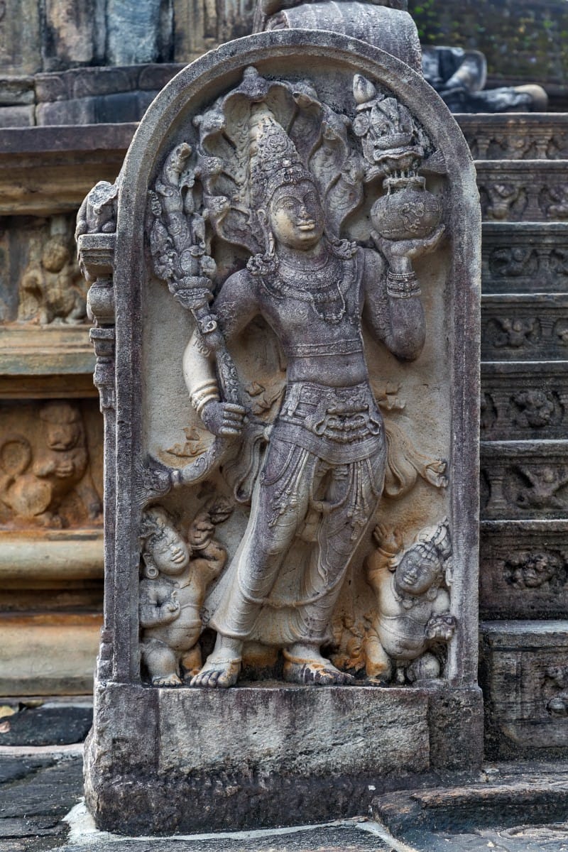 The Avukana statue is a standing statue of the Buddha near Kekirawa in North Central Sri Lanka. The statue, which has a height of more than 40 feet, was carved out of a large granite rock face during the 5th century. It depicts a variation of the Abhaya mudra, and the closely worn robe is elaborately carved.