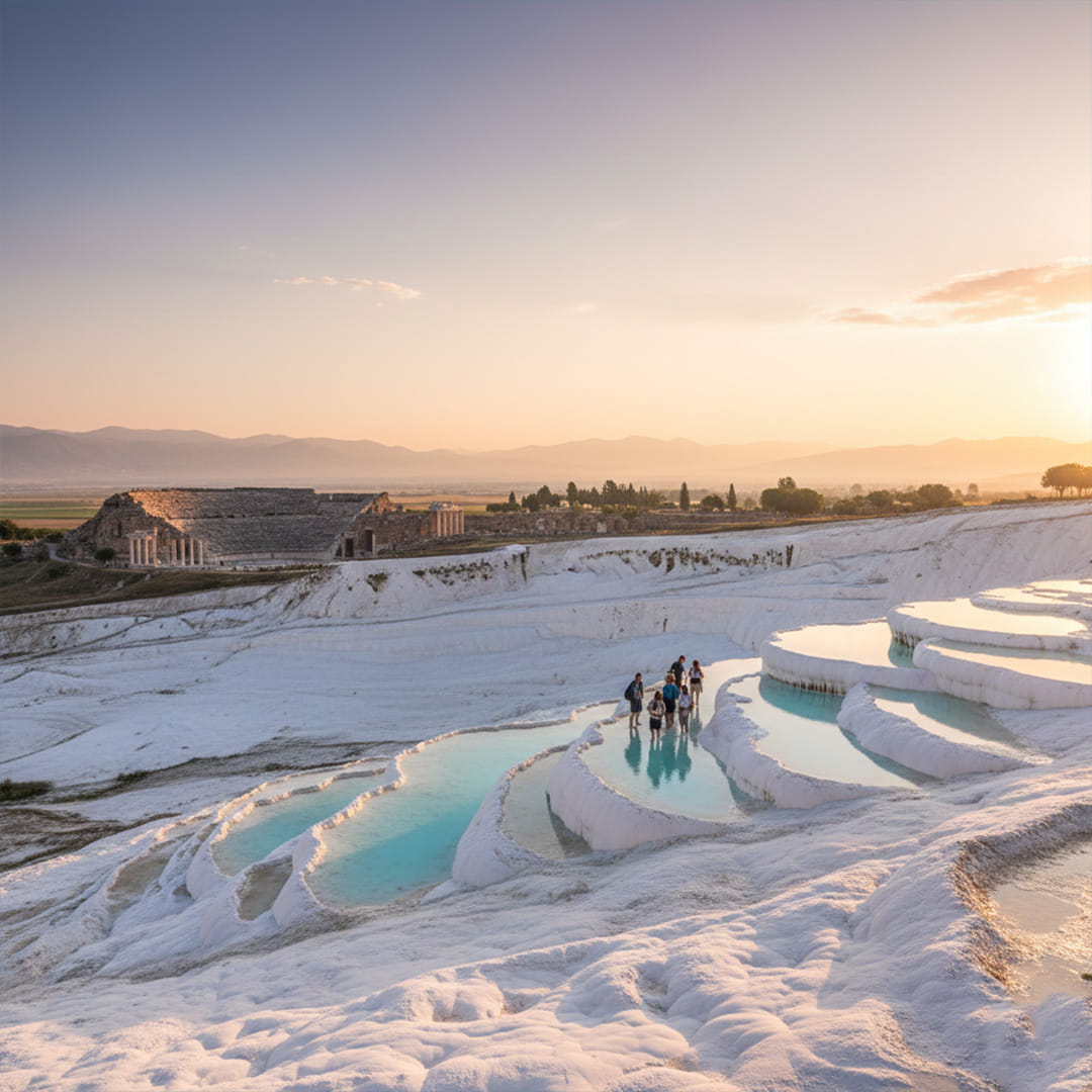 Depart for Pamukkale with a stop at the historic Sultanhan Caravanserai — a fascinating relic from the Silk Road era. Arrive in Pamukkale in the evening and enjoy dinner at the hotel. Optional thermal pool experience available.