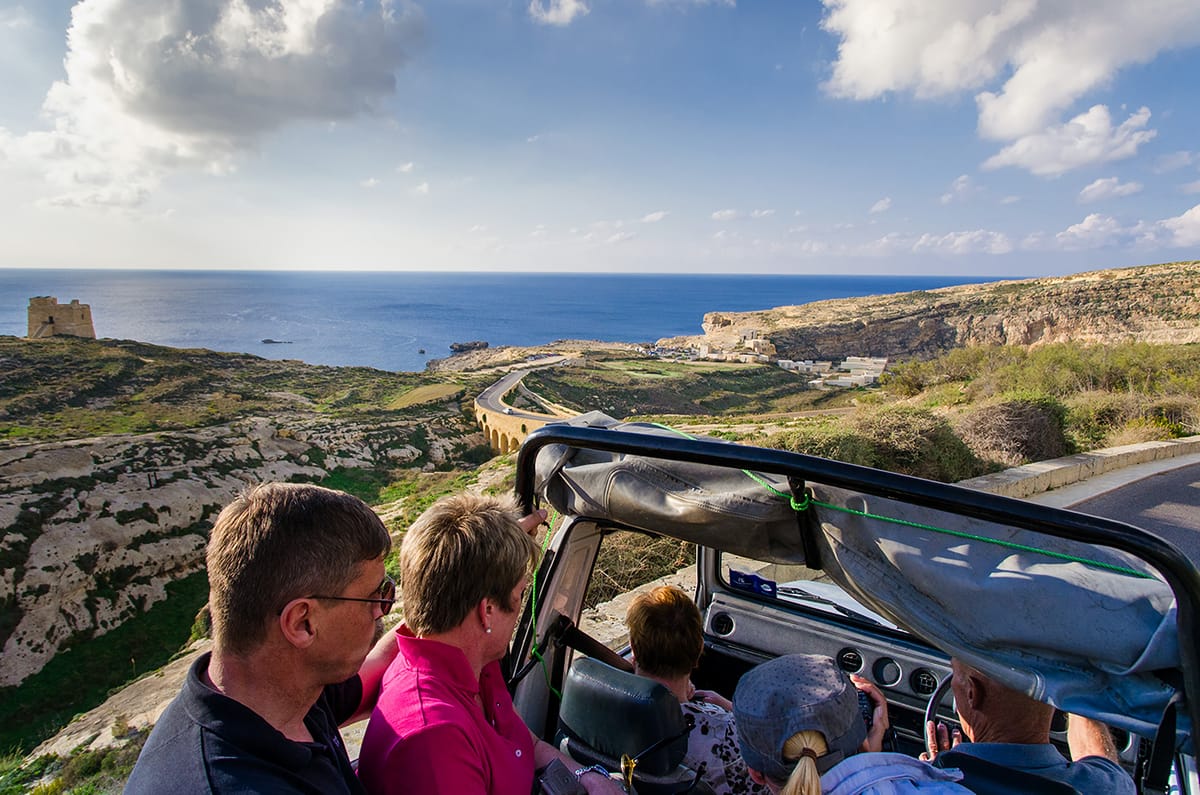 This exclusive Jeep tour is the best possible way to discover and experience the true beauty of Gozo, take spectacular photographs of the breath-taking scenery, experience Gozo’s magnificent heritage, visit key landmarks, and discover hidden gems, all while relishing the impressive beauty and distinctive charm this tiny island has to offer. Let one of our experienced drivers handle the driving and the stress of navigation while you sit back, unwind, and take in the scenery! In the morning, you will be picked up from your accommodation (or a close meeting point) to travel to the island of Gozo. Upon your arrival at Mġarr Harbour (Gozo’s main harbour), you will board one of our Jeeps, where you will be taken on an unforgettable journey around the beautiful island of Gozo. Each jeep will have one of our experienced drivers, who will also provide you with explanations and information throughout the entire journey. Additional information is provided at each stop in the language you have booked. As you travel through numerous villages, valleys, and backroads, you will enjoy the breath-taking beauty of the island of Gozo. The tour will take you to some of the most picturesque locations and significant landmarks on the island. You will visit gorgeous locations such as the Daħlet Qorrot Valley, the quaint village of Nadur, Ramla Valley, the famous Calypso Cave, and the megalithic temples of Ġgantija, a UNESCO World Heritage Site and the oldest freestanding structures in the world! Here you will also have some free time to visit the temples (entry ticket to Ġgantija Temples is not included). After enjoying a delightful buffet lunch washed down with some nice chilled Gozitan wine, you will proceed to the second part of the tour, which will take you to some other marvellous sites, such as the picturesque bay of Xlendi, the majestic mediaeval Citadel fortress, which is located in the heart of Victoria (the capital city of Gozo), a traditional limestone quarry, the gorgeous Dwejra Bay and its inland sea, where you will have the opportunity to take an optional boat trip (boat trip not included in the price), the Mielaħ Valley, and the famous salt pans, where you can learn how salt has been produced from the sea since Roman times.Driving past the seaside resort town of Marsalforn Bay, we will reach Mġarr Harbour, where you will board one of our boats for your return journey to Malta. During the boat trip, you will be passing by the beautiful island of Comino, catching glimpses of the famous Blue Lagoon, Crystal Lagoon, and the Sea Caves (the boat transfer is subject to weather conditions and other operational considerations; in the event that this is not feasible, the return trip will be done by using the communal Gozo Channel ferry).Weather permitting, during high season (usually from April till October), we will also stop for a refreshing swim at Comino Island (don't forget to bring your swimwear!).