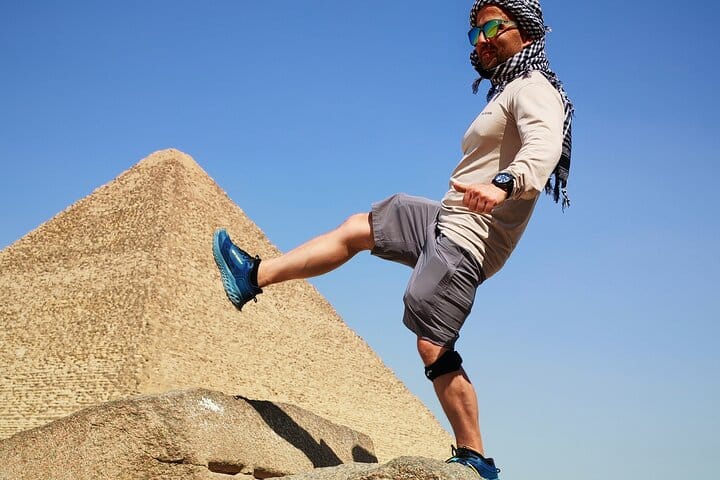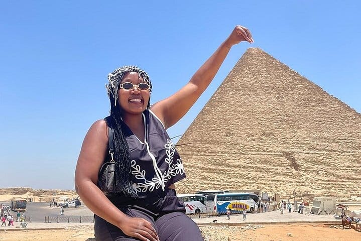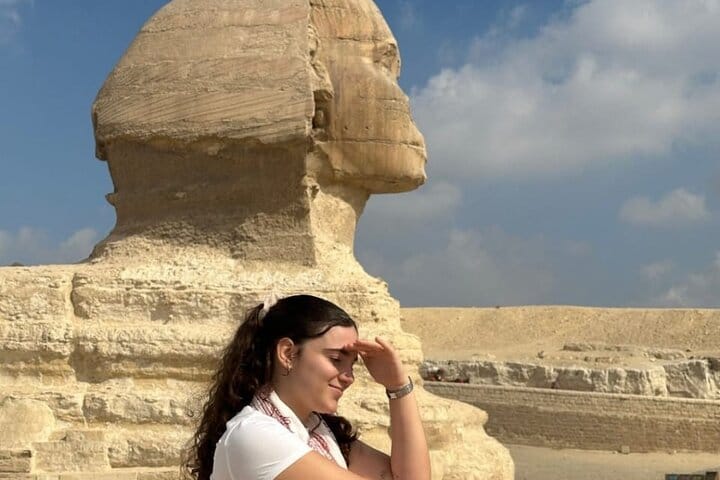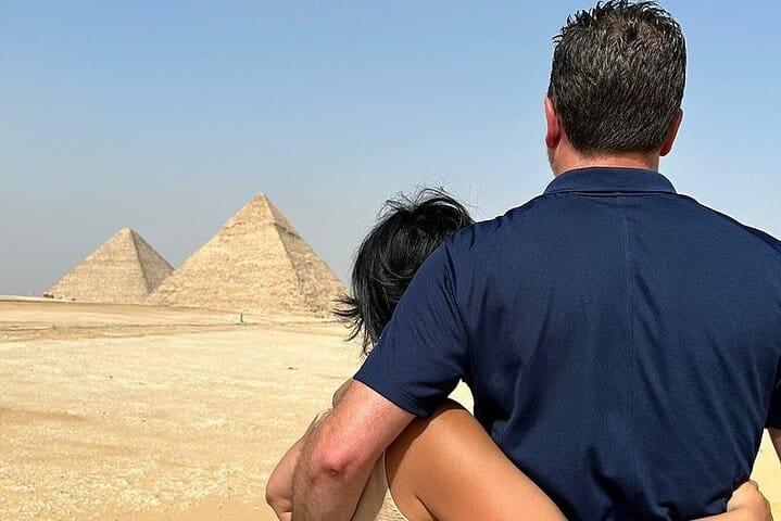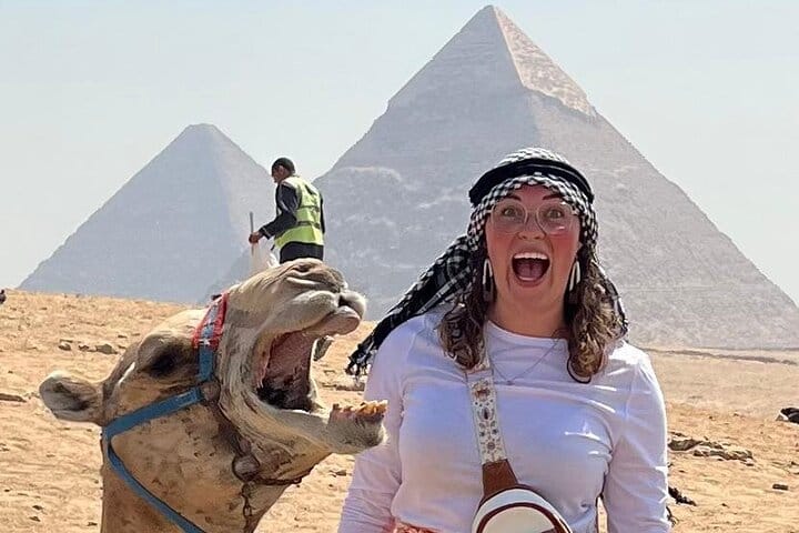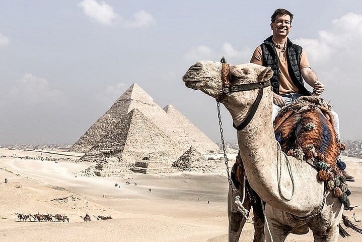 Explore the three majestic pyramids of Khufu, Khafre, and Menkaure, and uncover their fascinating secrets with your expert guide. Stand face-to-face with the Great Sphinx for iconic photos before entering the 3rd Pyramid (Menkaure) with your included ticket. Then, enjoy a 30-minute camel ride across the golden sands, with breathtaking pyramid views all around you. Don’t miss the panoramic viewpoint for stunning photos of the entire Giza Plateau. Finally, relax and savor an authentic Egyptian lunch at a local restaurant. All entrance tickets, hotel pickup, and drop-off are included for a hassle-free experience.