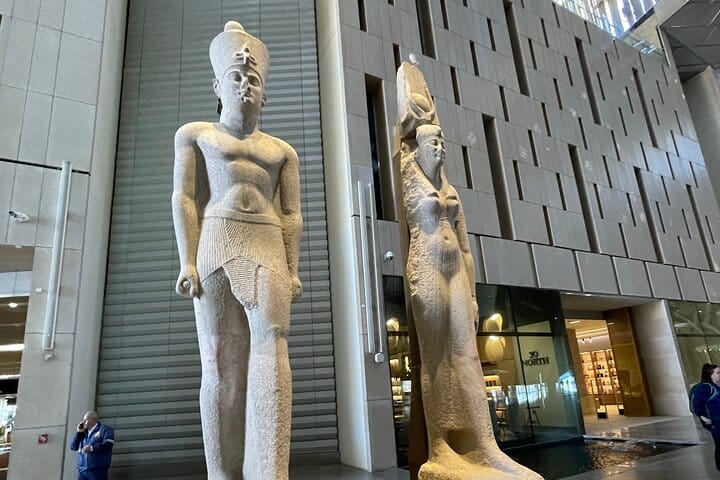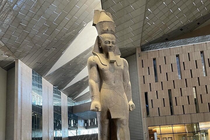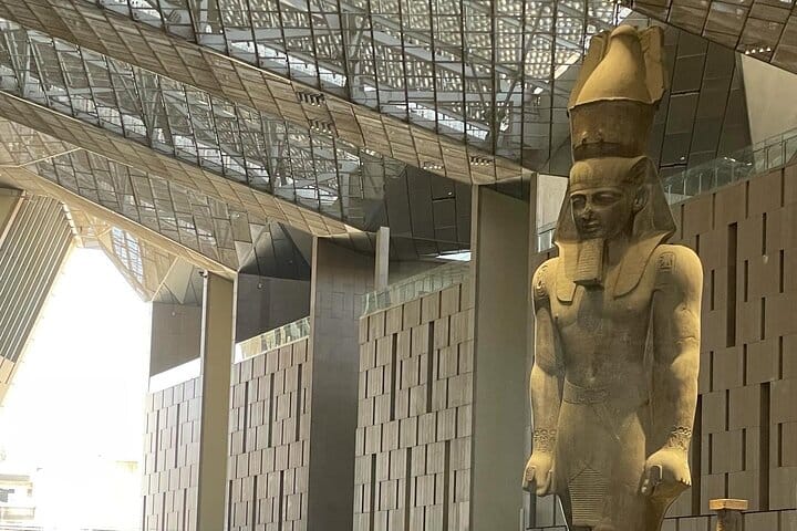 then driving towards The Grand Egyptian Museum , the World's Largest Museum with its impressive Colossal statue of King Ramses II and the Great staircase which hosts tens of egyptian artifacts ending with the view of Giza Pyramids .