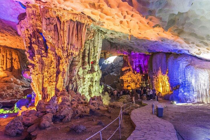 You will leave the boat and having around 01 hour to explore Sung Sot (Surprising) cave. This least known cave locates on a remote island, which is rare in cave-lake seascape. The compartment in the heart of Sung Sot cave is surrounded by extremely beautiful niches. The outside section has a high ceiling with lots of hangover. In particular, the second compartment suddenly expanded immensely with curved domes printed in streaks of very smooth and smooth hats, wholly over the head like a large, wide theater. This is the hugest and most beautiful cave in Halong bay, locates in core area of heritage site.