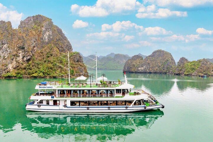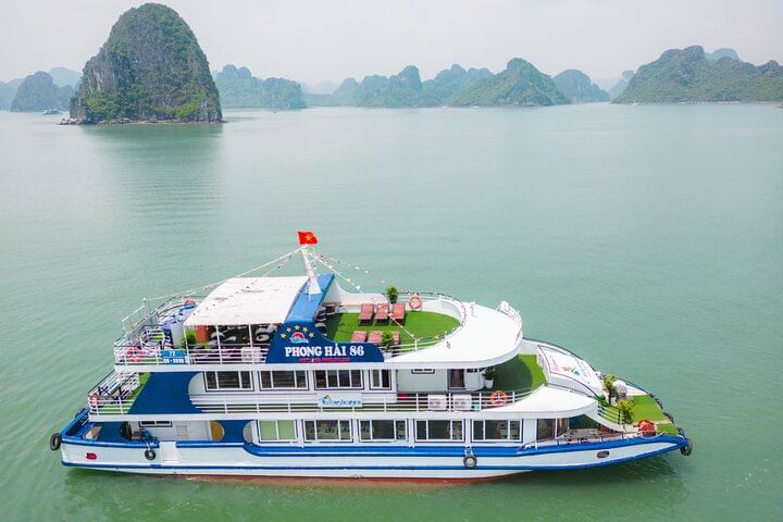 Lunch on board . Enjoy a nice set-menu lunch. By local flavors in each dish, it vitally helps to recuperate after a 4-hour-car drive. In the meantime, Our Cruise goes among islets, islands that make Halong becomes wonderland.