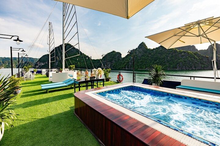 From the top of Titov island, you can enjoy the panoramic view of Ha Long Bay with thousands of limestone. Swimming at Titov beach. Or enjoy the Jacuzzi on boat.