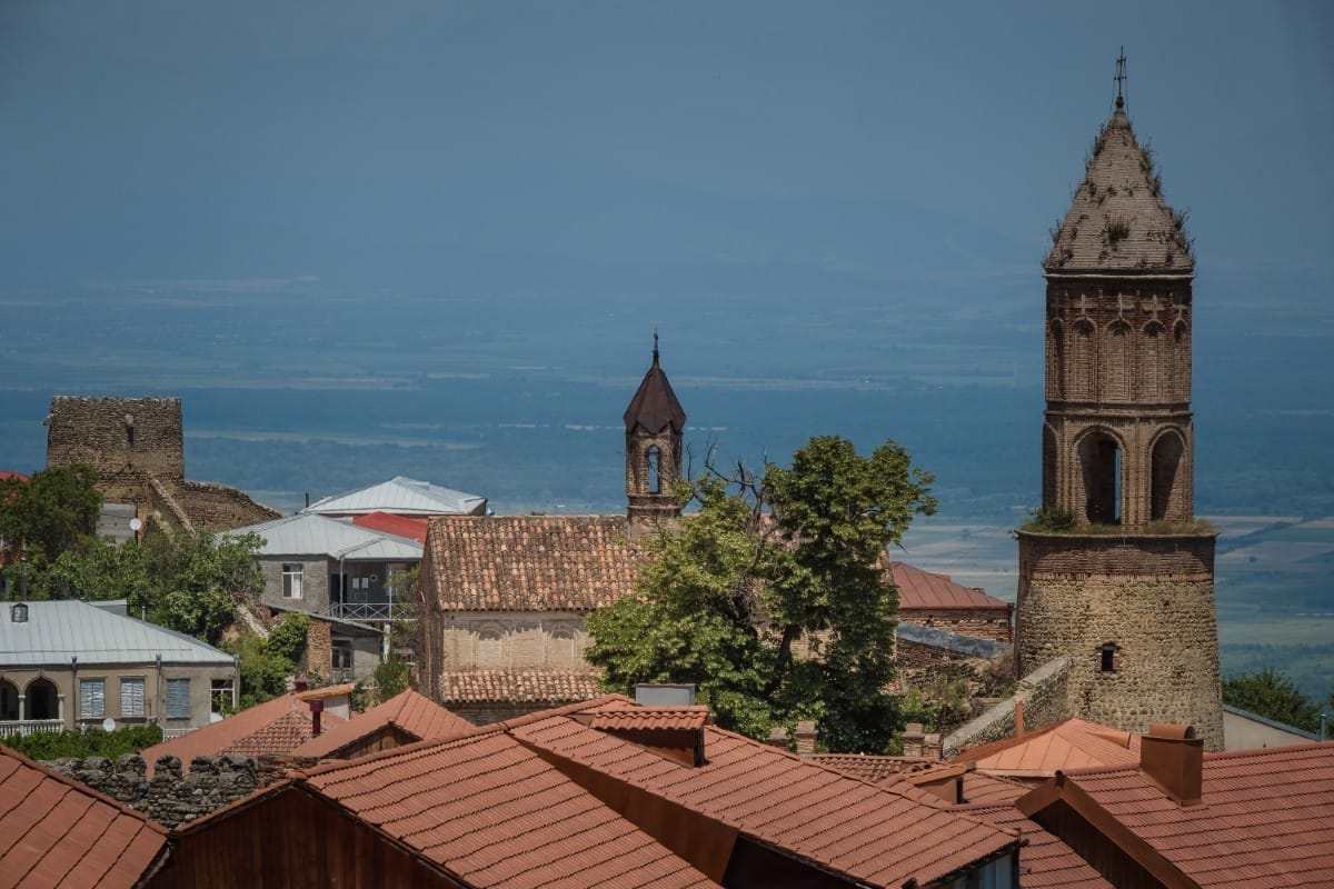 Signagi or Sighnaghi (Georgian: სიღნაღი) is a town in Georgia's easternmost region of Kakheti and the administrative center of the Signagi Municipality. Although it is one of Georgia's smallest towns,[4] Signagi serves as a popular tourist destination due to its location at the heart of Georgia's wine-growing regions, as well as its picturesque landscapes, pastel houses and narrow, cobblestone streets. Located on a steep hill, Signagi overlooks the vast Alazani Valley, with the Caucasus Mountains visible at a distance.