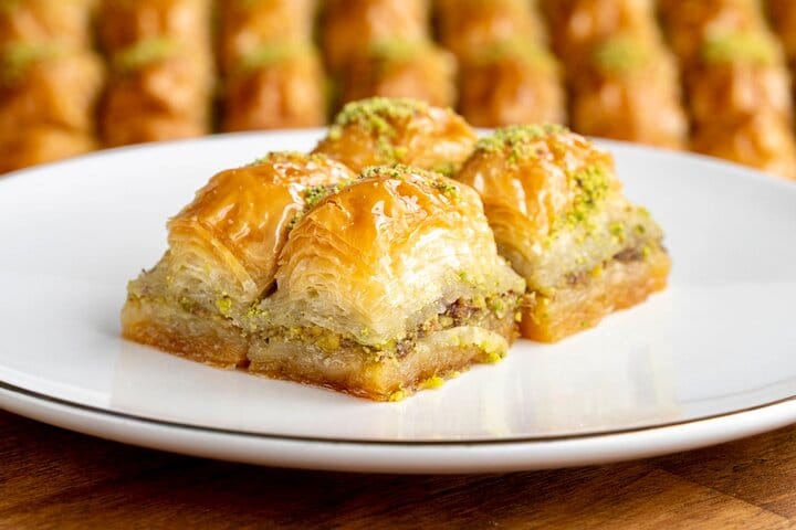 Baklava (baqlawah) is a rich, sweet pastry made of layers of filo pastry filled with chopped walnuts or pistachio and sweetened with syrup or honey.