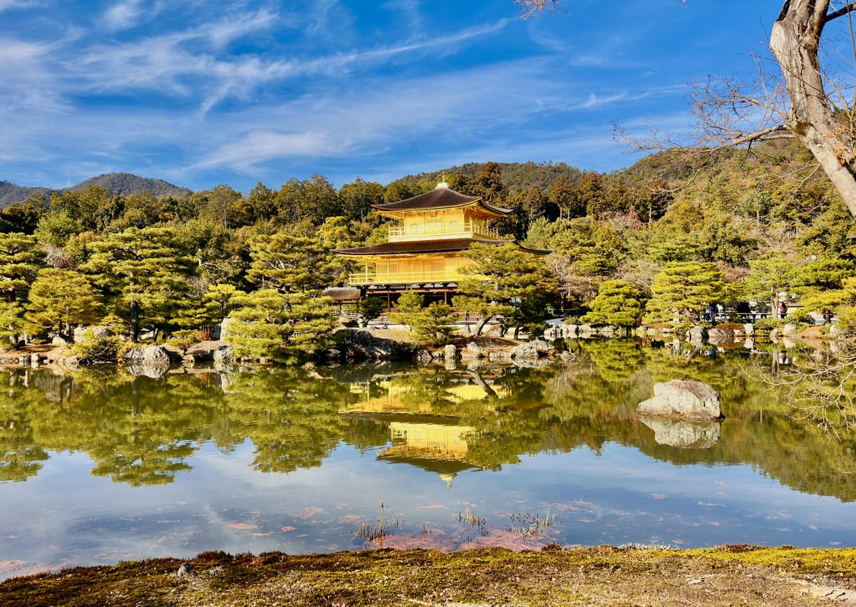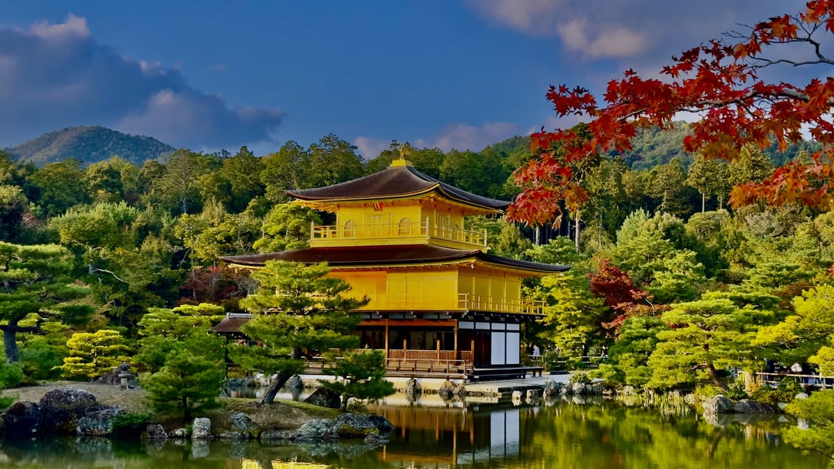 Admire this shimmering Zen temple, reflected in its tranquil pond, surrounded by seasonal blossoms that add elegance to its golden facade.