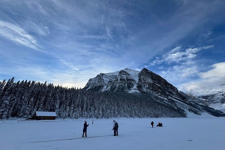 Lake Louise captivates year-round. Before winter, its emerald waters reflect the towering snow-capped peaks, while in winter, it transforms into a serene, frozen expanse encircled by majestic mountains.