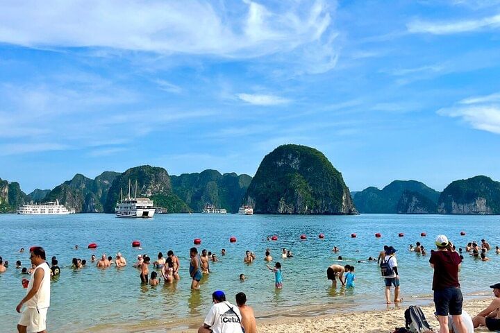From the top of Titov island, you can enjoy the panoramic view of Ha Long Bay with thousands of limestone. Swimming at Titov beach. Or enjoy the Jacuzzi on boat.