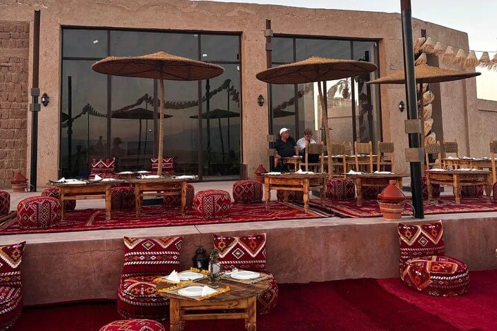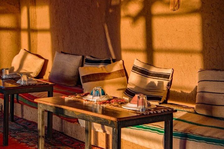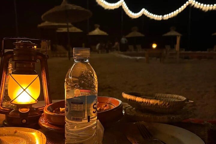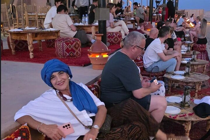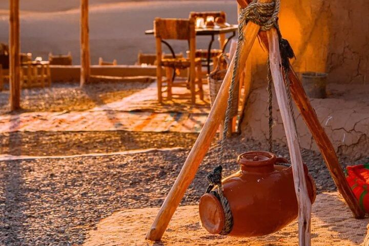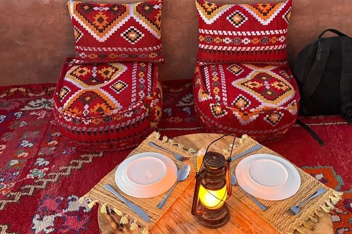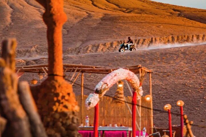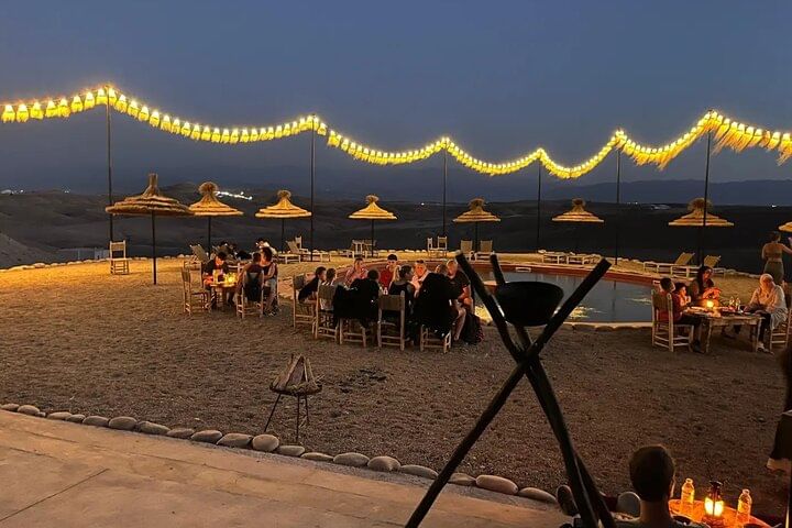 Escape to the Agafay Desert for a magical evening just one hour from Marrakech. Experience the breathtaking golden sunset over the rugged landscape before settling in for a gourmet dinner under the vast, starry sky. Your meal features authentic Moroccan cuisine enhanced with precious argan oil, sourced directly from local women's cooperatives. Learn how your visit supports female empowerment and sustainable community development, adding profound meaning to your journey.