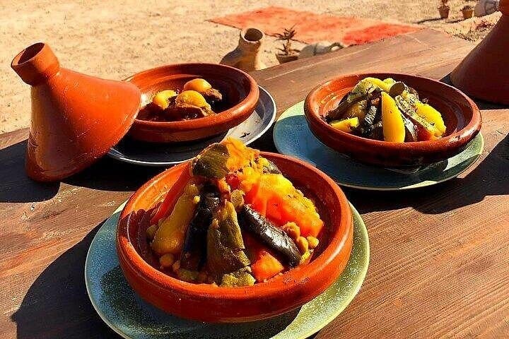Escape to the Agafay Desert for a magical evening just one hour from Marrakech. Experience the breathtaking golden sunset over the rugged landscape before settling in for a gourmet dinner under the vast, starry sky. Your meal features authentic Moroccan cuisine enhanced with precious argan oil, sourced directly from local women's cooperatives. Learn how your visit supports female empowerment and sustainable community development, adding profound meaning to your journey.