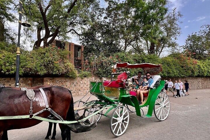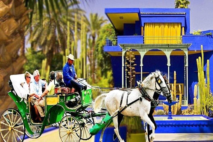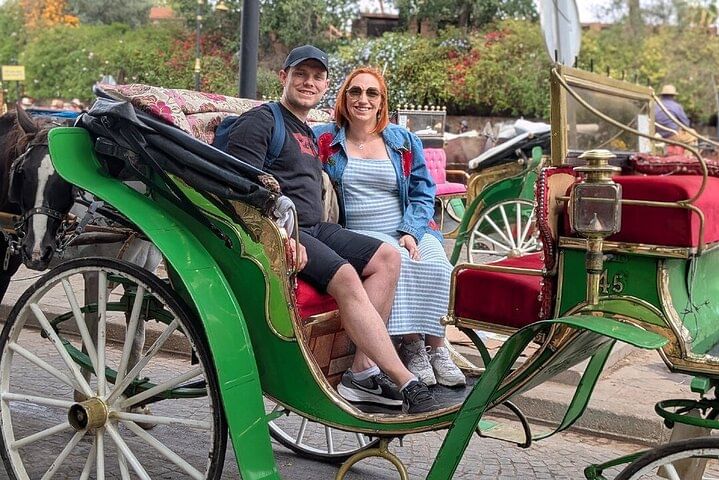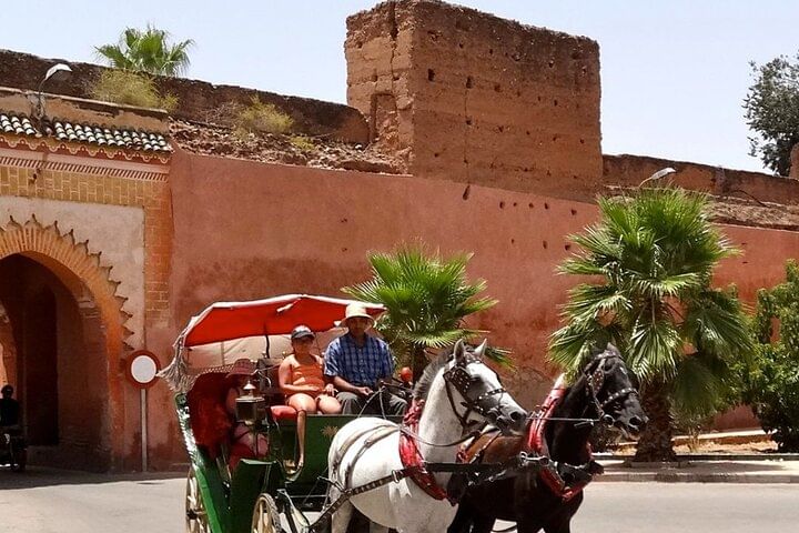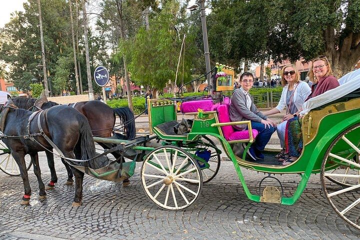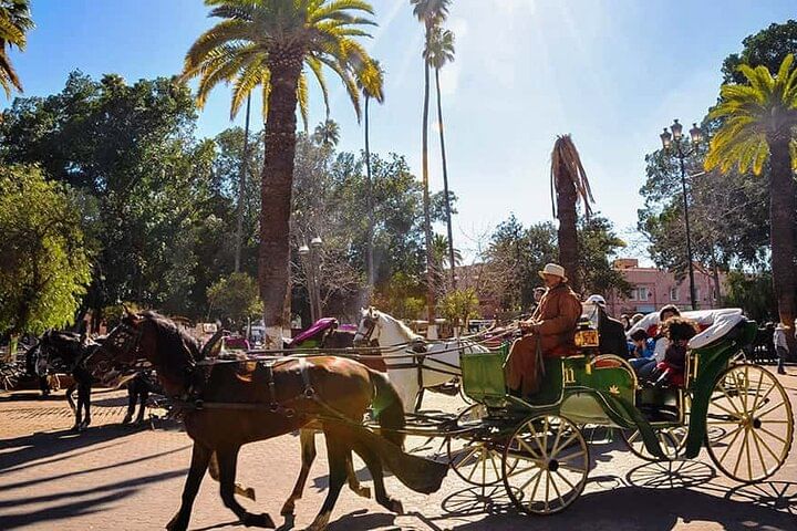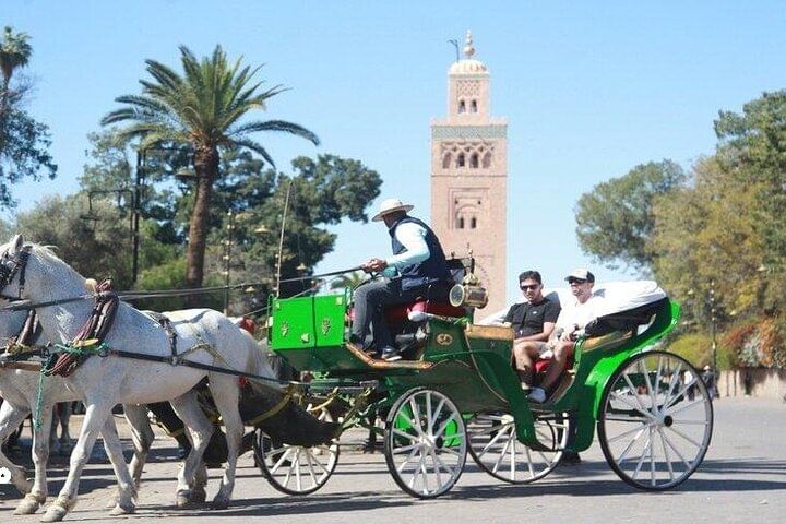 Experience the charm of Marrakech in a 1-hour horse-drawn carriage ride, a traditional and elegant way to explore the city's beauty. Relax as you pass by iconic landmarks such as Jemaa el-Fnaa, Koutoubia Mosque, and the historic Medina walls, taking in the vibrant atmosphere.