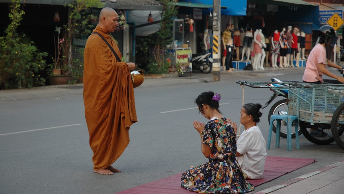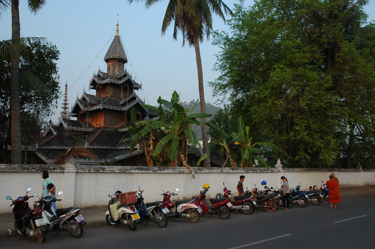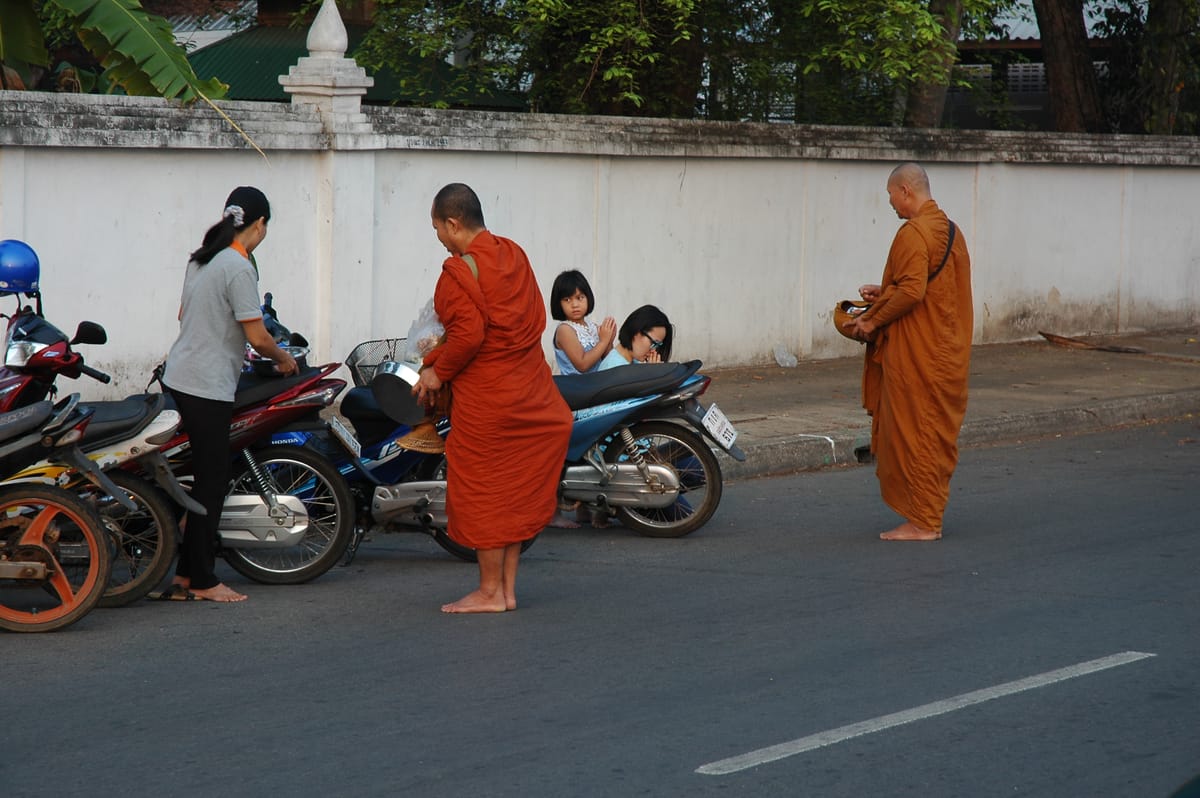 Continue to the main road and wait to see locals offering food to the monks. You may have made a small purchase in the market to give to the monk yourself. Your guide will tell you how to give the monk an offering. Monks are not allowed to buy or request for food, being one of the 227 rules the monks live by, so the locals will offer food, such as glutinous rice, to the procession of monks each morning.