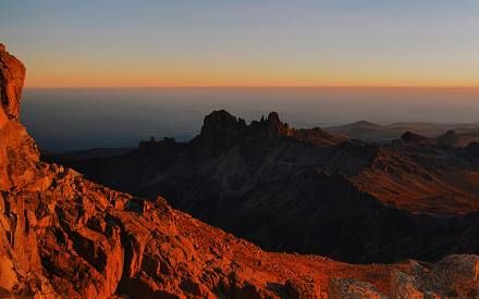 visible part towards lower Harris Tarns arriving Mount Kenya point Lenana 4,985m. (Shiptons/Point Lenana/Meru Mt Kenya Bandas/Chogoria Gate 11-12Hr, 26KMm 785m Ascent/Chogoria Gate) for sunrise and then start the descent to Mintos hut 4,200m (4kms) for breakfast and a panoramic view of the Gorge’s valley ( 2hrs.) and then continue down for 19km, 5-6hrs to Meru Mt. Kenya Bandas, 2,950m, for dinner and overnight.