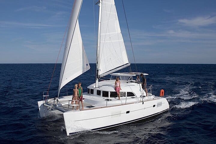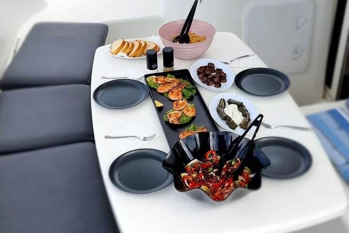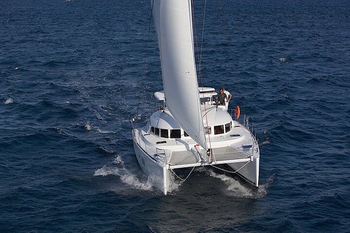morning or sunset cruise when you book. Then, on the day, depart from your hotel by air-conditioned minivan and travel to Mykonos new port for your cruise. Meet your professional skipper and crew, and find a comfortable spot on our modern catamaran.Sit back and admire Mykonos small white houses as your vessel pulls away from dock. Relax and enjoy the sea breezes, and take snaps of the views as your yacht cuts through the waves of the Aegean Sea. As you sail, enjoy the unlimited Mykonos traditional wine. After a short sail across the north part of the island, we pass by the small island of BAOS pirates island, then sail to the archeological site of Delos . As you arrive you will have a short stop in front of the of Delos where you can take pictures of the archaeological site from the catamaran as our hostess will explain to you some history of the island. Then we sail to the nearby island of Rhenia we drop anchor in a small beautifull cove with cristal clear turquoise water for swimm and snorkel as we serve our delicious full meal freshly cooked on board. As we arrive back we are pass by the famous little Venice for some amazing photos of mykonos windmills and mykonos town. If you’ve chosen the sunset cruise, soak up the sight of one of Mykonos golden sunsets. Take pictures and enjoy the moment as the sun unravel. Lastly, dock back at the port and finish your tour with a hotel drop-off.