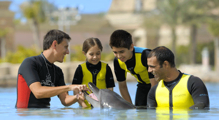 Enjoy an unforgettable experience during an Atlantis Dolphin Encounter at Dolphin Bay in Dubai. Wade into waist-high crystal clear waters and enter the playful world of our dolphins. Here you will come nose to bottlenose with one of the worlds most intriguing animals. This programme is perfect for families with young children or non-swimmers.