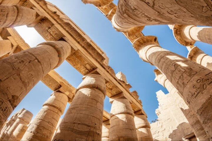 Finally, cross back to the East Bank to discover the colossal Temple of Karnak, an extraordinary ancient Egyptian temple complex. Built over two millennia, Karnak is a sprawling collection of temples, obelisks, and statues dedicated primarily to the god Amun, alongside Mut and Khonsu. Wander through the awe-inspiring Great Hypostyle Hall, marvel at its towering columns, explore the stunning reliefs and frescoes of the Festival Temple of Tuthmosis III, and contemplate the serene Sacred Lake, once used for ritual purification. Karnak temple stands as one of Egypt's largest and most significant examples of ancient Egyptian architecture, providing a powerful conclusion to your day of discovery.
