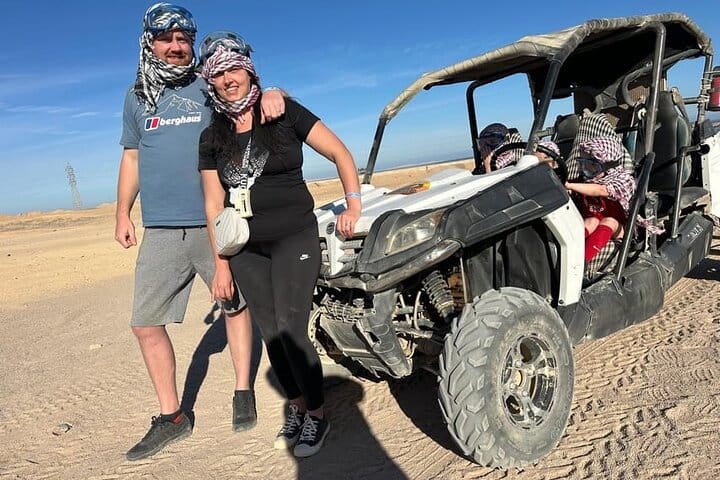 Experience the ultimate desert adventure with our Super Safari Full Day in Hurghada. This action-packed tour kicks off with an adrenaline-pumping ATV quad bike ride across the dunes, followed by a thrilling buggy car drive with an expert guide. Explore the desert landscape further with a Jeep safari to a traditional Bedouin village, where you'll immerse yourself in the rich culture of the locals. Enjoy a peaceful camel ride through the sands and refresh with authentic Bedouin tea. As the sun sets, indulge in a delicious Bedouin dinner under the stars, accompanied by an amazing oriental show that will leave you mesmerized. Your day of adventure is complete with bottled water provided throughout the tour to keep you hydrated.