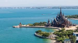 The huge building is more than 100 meters high. The Sanctuary of Truth, which is also called Prasat Satchatham or Prasat Sut Ja-Tum is not in use as a temple. It is build on an area of almost one acre on Rachvate Cape overlooking the sea in North Pattaya.