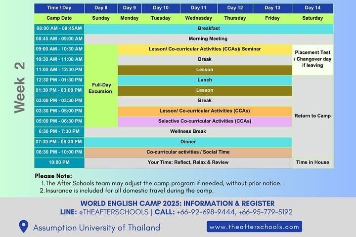 • Fee includes: accommodation, all meals, 2 full-day excursions, and insurance