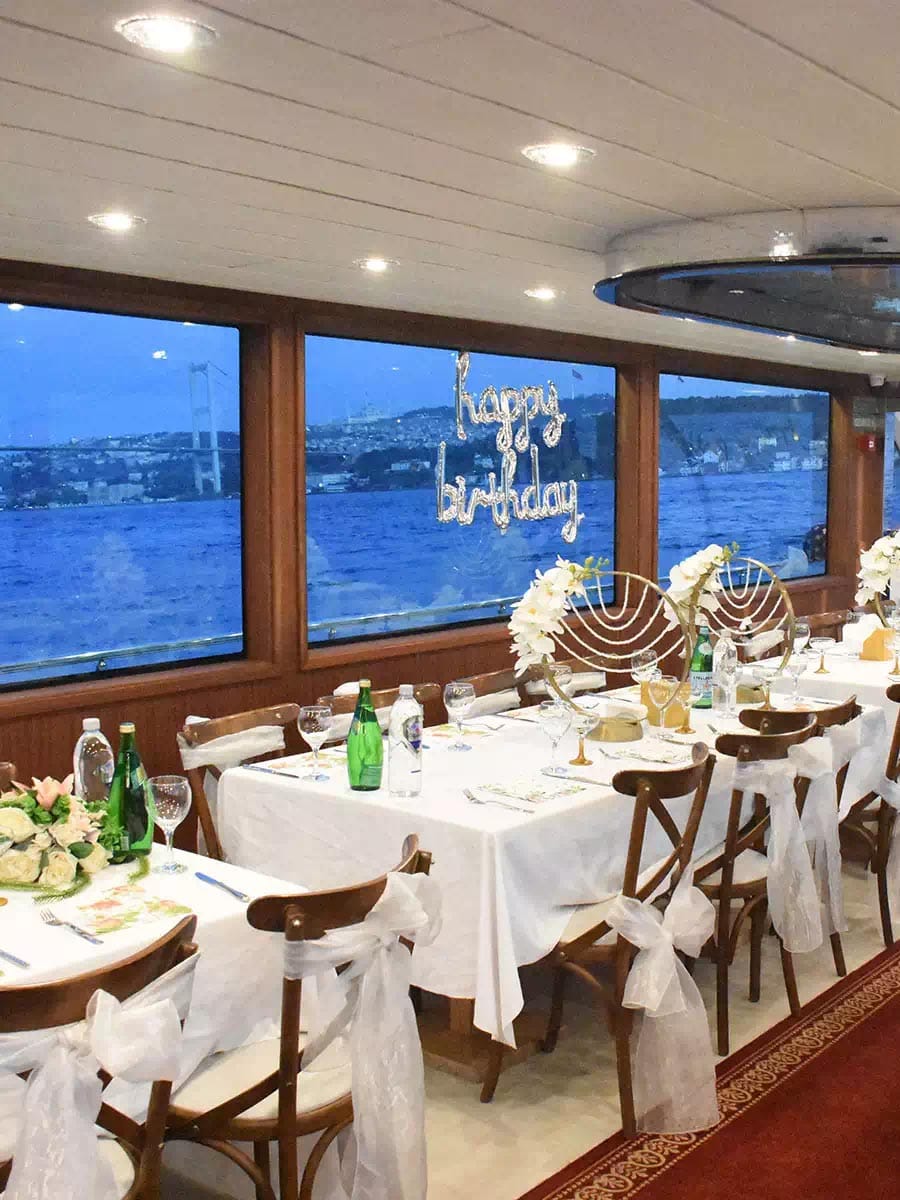 Istanbul Yacht Birthday PartyYacht Birthday Party in Istanbul – Celebrate on the Bosphorus with Bosphorus SunsetCelebrate your special day in the most unforgettable way with a Yacht Birthday Party on the Bosphorus. At Bosphorus Sunset, we specialize in creating exclusive and luxurious birthday experiences on the water, offering fully customized birthday yacht rental services in Istanbul. Whether you’re planning an intimate gathering or a lively celebration with friends and family, our yachts provide the perfect setting for a truly memorable event.A yacht birthday party allows you to enjoy Istanbul’s iconic skyline while celebrating in complete privacy and comfort. From elegant decorations to world-class service, every detail is carefully planned to reflect your style and expectations. Our yacht birthday rentals are designed to offer flexibility, luxury, and unforgettable moments on one of the world’s most beautiful waterways.Customized Birthday Parties on a Private YachtWhen you choose Bosphorus Sunset, you are not just booking a boat — you are creating a full birthday party on the boat experience. We can organize an unforgettable celebration for you and your guests with a wide variety of food and beverage options from world cuisine. From gourmet dinners to cocktail-style buffets, our menus are fully customizable to match your preferences.Our first-class staff pampers your guests with exceptional service, offering:Special birthday menus