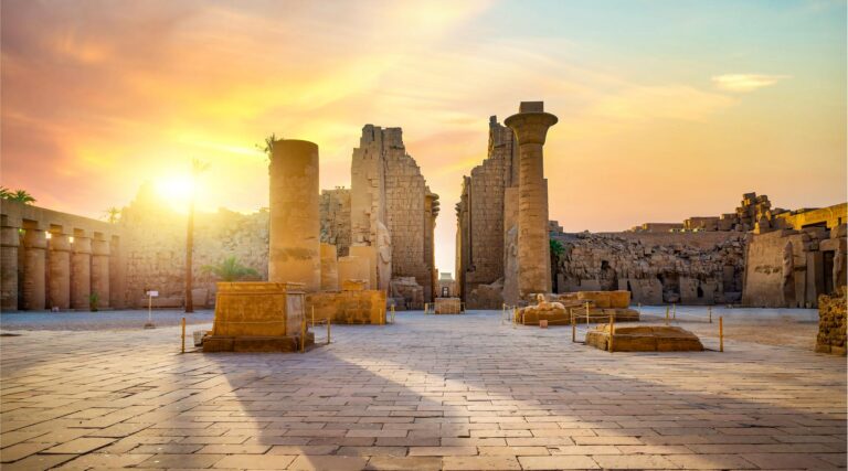 Luxor Temple is a strikingly graceful monument in the heart of a modern town, Luxor on the east bank of the Nile River, Egypt. This magnificent temple complex is constructed by the New Kingdom pharaohs Amenhotep III (1390โ1352 BC) and Ramses II (1279โ1213 BC). The main function of this complex was during the annual Opet festivals, when the statues of Khonsu, Mut, and Amun, were moved from Karnak and Avenue of Sphinxes, then reunited here during the inundation.